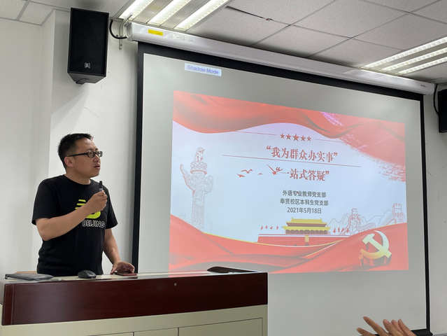为深入推进党史学习教育,进一步把学习党史同推动工作相结合,切实为外院学子办实事、解难题,5月18日,开元集团网站外语专业教师党支部联合奉贤校区本科生党支部积极响应“我为群众办实事”的号召,在奉贤校区开元集团网站E401教室为2018级本科生开展 “一站式”答疑活动。开元集团网站副院长张正军、党委委员王慧,外语专业教师党支部代表幸君珺、张举栋,奉贤本科生党支部书记侯月,开元集团网站教务老师盛雅华出席活动。活动由张举栋主持。