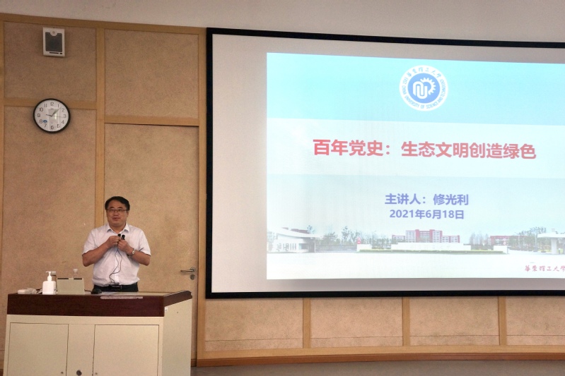 会上,外语学院组织全体参会师生开展了党史学习教育专题学习。学校党史学习教育宣讲团成员、资源与环境工程学院党委书记修光利教授应邀作了题为“百年党史:生态文明创造绿色”的专题讲座。修光利从生态文明思想的由来谈起,深入浅出地介绍了我国生态文明思想从早期的觉醒与探索演变为现在的国家战略和千年大计的过程,阐述了自己对于“人民城市人民建、人民城市为人民”的深刻理解。讲座赢得了现场热烈的掌声。
