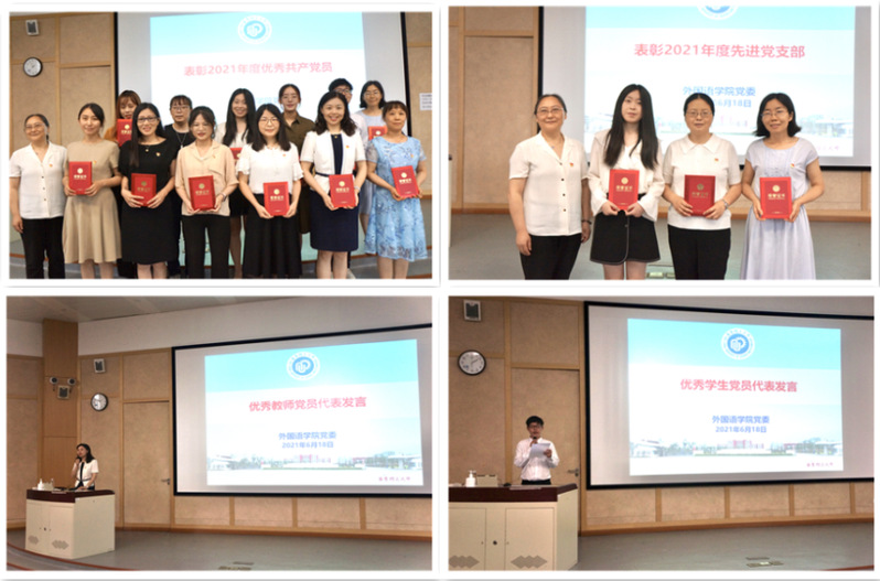 为从党的百年伟大奋斗历程中汲取继续前进的智慧和力量,深入学习贯彻习近平新时代中国特色社会主义思想,6月18日,外语学院召开庆祝中国共产党成立100周年表彰大会,激励各党支部不断提升基层党组织组织力,激励全体共产党员巩固和深化“不忘初心、牢记使命”主题教育、“四史”学习教育和党史学习教育成果,创先争优,建功立业,满怀信心迈进全面建设社会主义现代化国家新征程。外语学院党政班子成员、全体教师及学生党员代表参加会议。会议由外语学院党委副书记、院长赵宏主持。