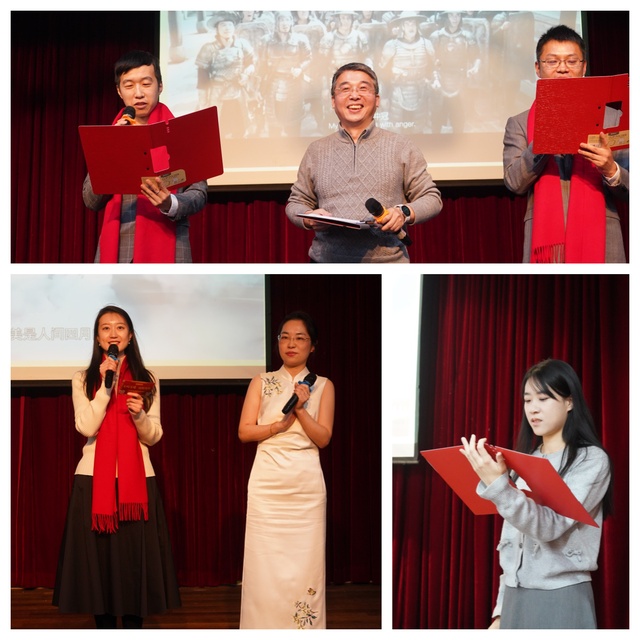 研究生组华静的独唱、日语系包雅梅和德语系陈雨田的歌曲表演、外语实验教学中心路峰的口琴串烧等节目精彩纷呈,赢得了阵阵掌声。研究生组饶小飞,黄嫣,武越,林洁心中英双语诗朗诵《读中国》、大学英语组周德宇和王英杰的对唱《上春山》以及英语系张先刚、陈维、王陈欣多语种朗诵的《满江红》更是让人耳目一新,展现了老师们的多才多艺。