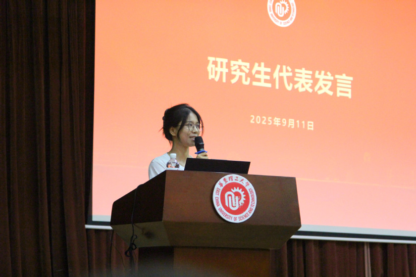 25学硕汪晨怡同学代表研究生新生发言。她围绕Sound, Foundation, Link三个关键词分享了自己的体会,希望能在未来的学习生活中培养跨文化能力、拓展知识边界、服务时代所需,激励大家以滚石上山的毅力、以赤诚热爱的初心,坚韧追求真知、开阔拥抱世界,在机遇与挑战并存的时代,共同书写属于外院人的精彩篇章。