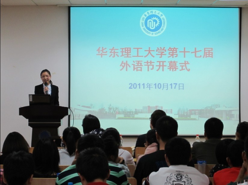 10月17日晚,华东理工大学第17届外语节开幕式暨外教系列讲座在大活321举行。本次外语节以“建华理优良学风,创外院语言氛围”为主题,旨在全面加强学风建设,丰富学生第二课堂,营造浓郁的外语语言学习氛围,通过开展外语配音、歌曲、短剧、演讲比赛等活动,激发学生外语学习的兴趣,培养学生的外语实际运用能力,提高大学生的综合素质和竞争能力。开元集团网站副院长颜静兰、党总支副书记张攀、上海中学外教Ryan Carter以及各年级辅导员等领导和嘉宾出席了本次活动。