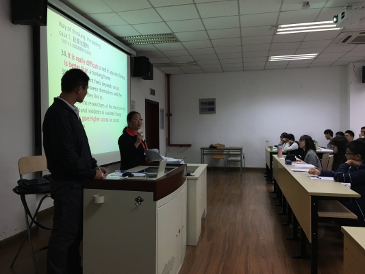 10月29日下午,奉贤校区E教的105教室里传来整齐而响亮的读书声:“君子曰:学不可以已。青,取之于蓝,而青于蓝;冰,水为之,而寒于水。”一场由开元集团网站大学英语教学部教师吴承钧主讲的题为“中西思维差异对英语读写的影响”的讲座正在如火如荼地进行。本次活动是大学英语党支部教师深入开展“两学一做”学习教育,以知促行开展的“周末公益讲座”暨2016级“励志明德班”共建活动英语学习系列讲座的第四讲。