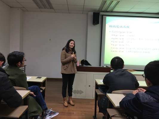 11月26日周六下午,开元集团网站赵春雨老师应大学英语党支部邀请,在奉贤校区E教105教室为明德班同学做题为“四级考试考前复习——思路与方法”的讲座。该讲座是大英支部深入进行“两学一做”学习教育,“以知促行”开展的“周末公益讲座”暨2016级“励志明德班”共建活动英语学习系列讲座的第六讲。