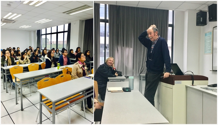 Pohl教授讲学的内容涉及德国古典文学、中德文学交流、中德跨文化交际及当代德国的中国形象及社会问题等多方面学术前沿和热点。在“当代德国社会现状”的讲座中,Pohl教授详细介绍了目前德国社会的热点问题,即难民问题的起因、发展和未来的趋势。他从政府各党派的选择、难民问题给德国社会带来的难题等方面展开阐述,内容生动有趣,颇具启发。在“当代德国的中国国家形象”报告中,Pohl教授从马可波罗小说中的中国形象开始,讲述中国人在德国人眼中形象的变迁发展历史。在“《庄子》、鲁迅的《起死》和恩岑斯贝格对庄子的重写”专题讲座中,Pohl教授对“庄子问骷髅”、鲁迅的“起死”以及恩岑斯贝格对“起死”的改写3个文本进行阐释与对比,分析了庄子的哲学主题在不同时期的中德两国,尤其是左翼作家间的接受。Pohl教授还深入浅出地介绍了中德跨文化交际的方法论问题,引起不少教师和学生积极提问,现场气氛活跃。