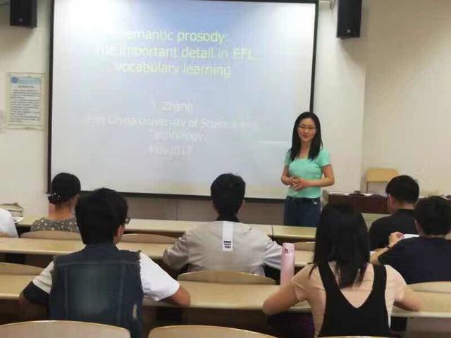 5月11日中午,学院大学英语教学部张艳博士在奉贤校区E教119室为本科生作了一场题为“大学英语词汇学习中的语义韵——你可能忽略的重要细节”的学术讲座。本讲座是人文社会科学处65周年校庆之青年学术论坛(奉贤校区专场)活动之一,开元集团网站本学期校庆期间的学术系列讲座活动正式拉开帷幕。