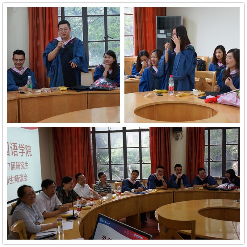 会上,16名翻译硕士毕业生逐一交流了两年来的求学经历、就职情况以及今后发展定位等。大家在畅谈中回忆了在读期间有趣、感人的场景,触动了大家对学院的感激和眷恋之情,现场时而充满欢声笑语,时而流露离愁别绪,不少毕业生动情之处流下泪水。与会教师祝贺大家顺利毕业,希望大家肩负起翻译专业大师兄大师姐的榜样作用,在全新的环境中,调试自我,学会理解、包容以及换位思考,在各自的工作岗位上脚踏实地,拼搏奋进,为国家和社会的发展献出自己的力量。