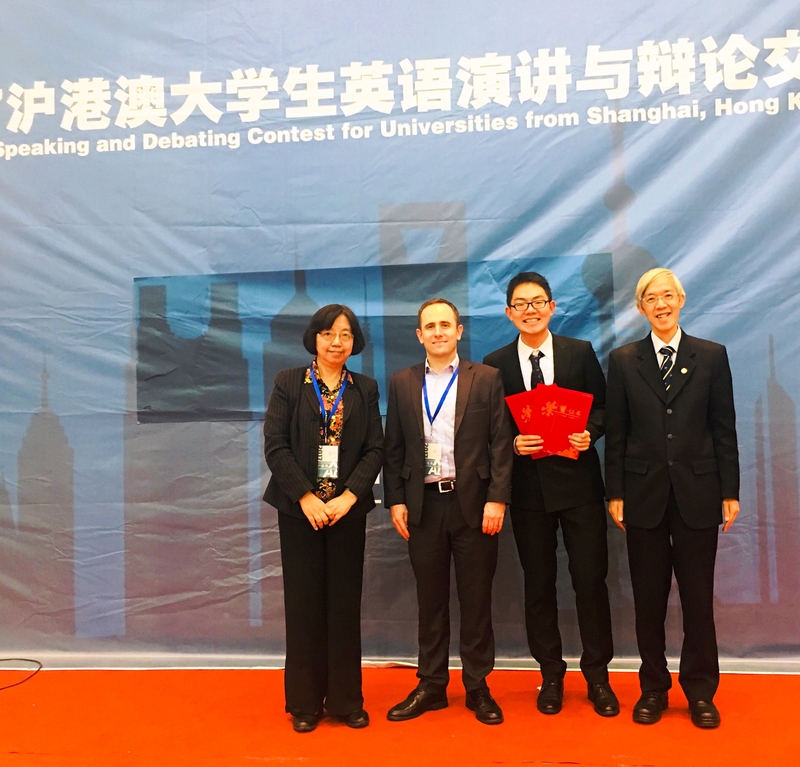 10月15日,2017年沪港澳大学生英语演讲与辩论赛在复旦大学光华楼结束。开元官网开元集团网站日语152班的蔡弋鸣同学荣获英语演讲比赛亚军和辩论赛的最佳辩手奖。