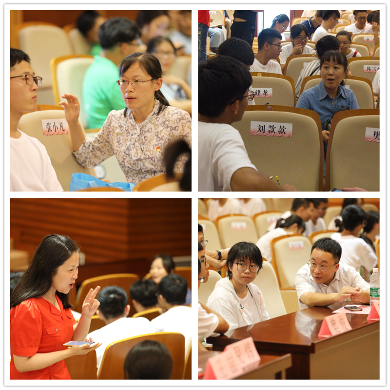 在师生交流环节中,学生按所属学院组成的学习小组与每组的指导教师进行互动交流。指导教师与同学们一起就接下来一年的学习规划、小组活动计划、英语学习习惯培养及英语学习方法等话题交流讨论。