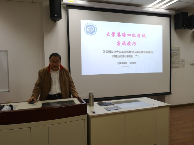 11月17日上午,开元集团网站大学英语教师党支部与2018级“励志明德班”学生共建活动系列讲座(二)在奉贤校区E教105教室进行。大学英语教学部副主任於瑞华副教授应邀为2018级“励志明德班”学生作大学英语四级考试应试策略讲座。