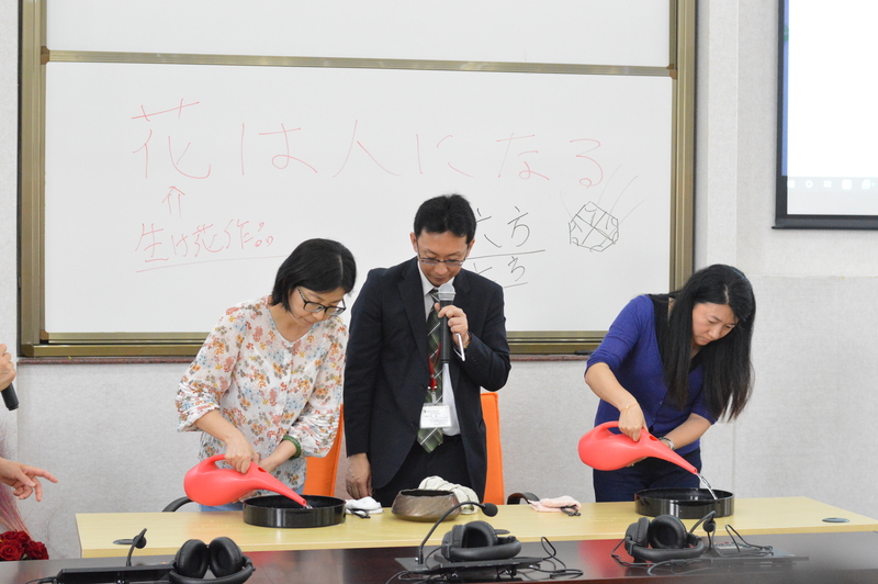 高桥教授对草月流的由来和三代的历史沿革进行了介绍,并借助花枝等插花材料,绘声绘色地对草月流崇尚的造型自由烂漫的“自由花”进行阐释。高桥老师通过对“花は人になる”的概念的解释,与现场的师生进行了精彩互动,讲述了在制作花道作品的时候应该持有的礼仪与心态。