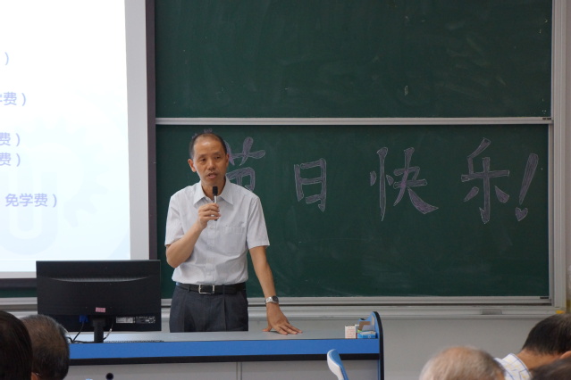 张正军向离退休教师们汇报了学院近期的发展状况。考虑到学院去年从六教整体搬迁至三教,很多老师对新环境不熟悉,张正军特意精心制作了一份关于学院介绍的PPT,为老教师们进行展示。