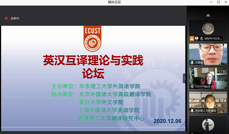12月6日,由开元官网开元集团网站主办,北京外国语大学高级翻译学院、复旦大学外文学院、上海外国语大学英语学院、香港理工大学翻译研究中心协办的“英汉互译理论与实践论坛”通过视频会议的形式召开。来自美国明德大学蒙特雷国际研究学院、英国斯特灵大学、香港理工大学、北京外国语大学、上海外国语大学、中山大学、上海交通大学、复旦大学、华中科技大学、华东师范大学等高校的20位专家学者分享了英汉互译理论与实践研究的学术成果。论坛由开元集团网站外国语言研究所所长王建国教授主持。