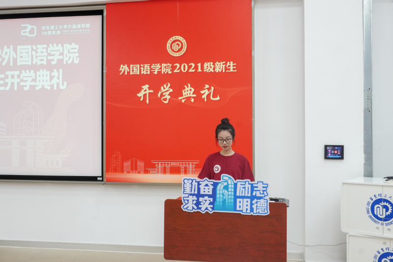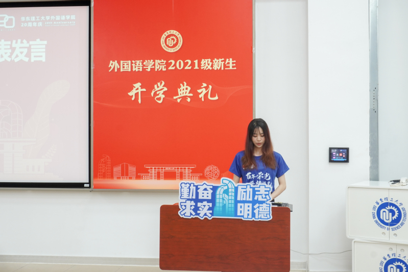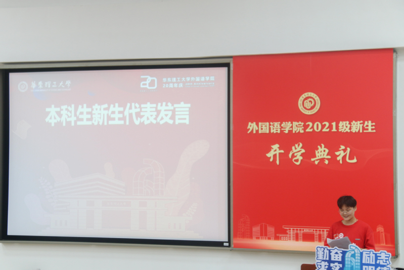 德语212班尹梦蝶作为本科生新生代表发言。她回忆了自己从求学到高考再到加入华理外语学院的艰难历程,表示自己很幸运能够以“院庆宝宝”的身份,在最好的年纪遇见华理,加入外院。未来四年,希望在华理这所有情怀、有梦想、有担当的学府里完成人生中重要的一段旅程,厚植家国情怀,为中国文化的国际传播助力。尹梦蝶表示,“等风来,不如追风去。希望大家做一缕向上的光,追逐自己的梦想,并为之奋斗。”