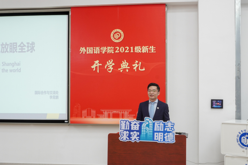9月23日下午,外语学院2021级新生开学典礼在奉贤校区C200教室举行。外语学院党委书记王喆,党委副书记、院长赵宏,校国际合作与交流处副处长李霄鹏,学院副院长张正军、吴建伟、韦晓保,哈德斯菲尔德大学科技创新孔子学院中方院长郑国锋,研究生导师组组长、外国语言研究所所长王建国,德语系副主任倪晓慧,全体新生班导师、辅导员以及161名本科新生、53名研究生新生参加典礼。典礼由外语学院党委副书记樊俊主持。