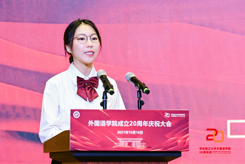 科技英语专业82级校友、仁达集团总裁何羿,宝钢优秀教师奖获得者、国家级一流课程负责人、英语系王慧,院学生会主席、英语194班徐欣玥分别作为校友代表、教师代表和学生代表发言。他们饱含深情地回顾了自己在学院的点点滴滴,汇报了自己的发展情况,表达了对学院、师长的感激之情和美好祝愿。