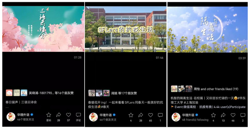 自2022年3月的疫情暴发以来,外语学院团委、奉贤校区本科生党支部积极利用华理外语微信公众号、视频号等多种宣传平台,架起了与学生沟通的桥梁。“分享抗疫期间的小确幸”“线上歌会”“三语云诗会”等特色活动成为了师生们居家战“疫”的心灵滋养。各种丰富有趣的活动不仅使得碎片化的时间更有意义,还向师生们传递了“疫情拉开了距离,却隔离不了爱”的同心战疫正能量。