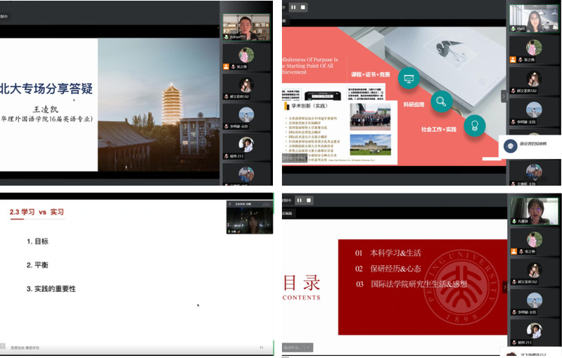 会上,张之燕结合英语专业多年来的办学情况和当下的疫情形势进行了简短的致辞。孙敏唯回顾了她在华理的本科学习生涯,并围绕本科课程学习、学科竞赛、科研应用以及社会工作实践等方面与同学们分享了自身的成长经验。王凌凯结合自身北大学习与择业经历,细致地回答了同学们的诸多问题,提供了很多学习方法与指导,并与同学们分享了在北大学习的心路历程与感受。刘菁主要围绕人生规划与学习方法,鼓励同学们从“自我”出发,了解自我并开拓自我。孔嘉琪结合自身本科学习、学科竞赛、保研经历以及研究生生活,与同学们分享了专业学习方法,提供了未来规划指导。
