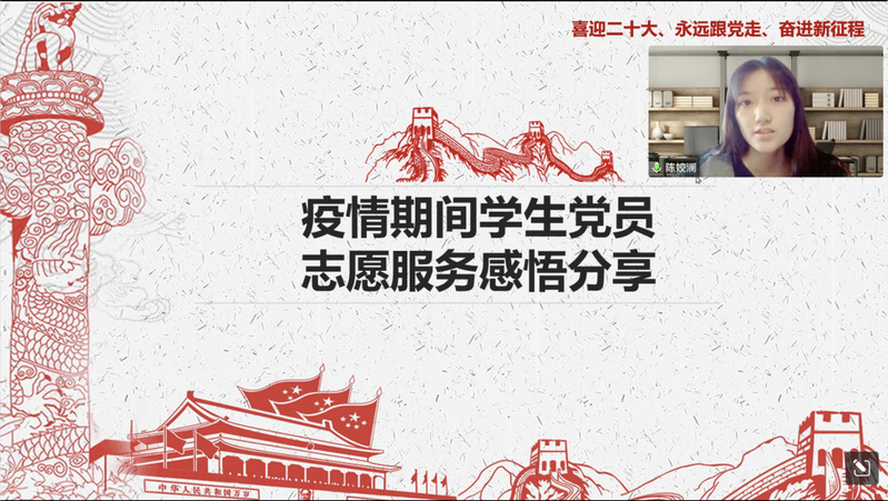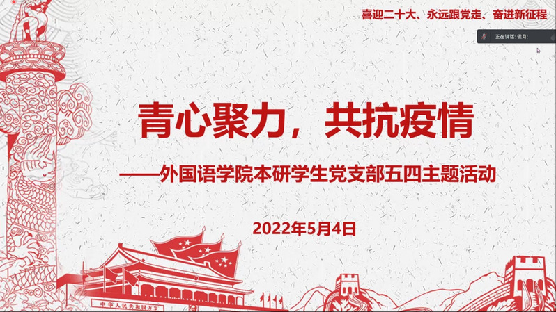 为响应习近平总书记“继续发扬历史主动精神,以实际行动迎接党的二十大召开”的号召,进一步体悟新时代青年的历史使命和责任,同时为在抗疫攻坚克难的重要关头传递同心战疫的正能量,开元集团网站全体本研学生党员于5月4日中午相聚云端,联合举办了“青心聚力,共抗疫情”五四主题活动。开元集团网站党委副书记樊俊出席本次活动,活动由奉贤校区本科生党支部书记侯月主持。