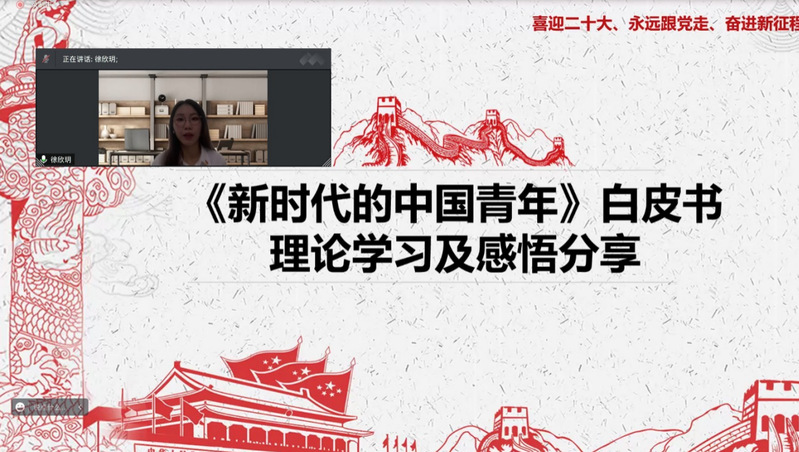 会议伊始,全体党员在侯月的带领下共同学习了《新时代的中国青年》白皮书。该书中详细阐述了广大青年发展事业的蓝图。与会党员们纷纷感慨,作为新时代的幸运儿,要紧跟新时代的前进脚步,坚定理想信念。奉贤校区本科生党支部徐欣玥在发言中表示,很庆幸自己生逢中华民族发展的最好时期,要珍惜这来之不易的美好生活,饮水思源,以实际行动担负起历史赋予的使命,为实现中华民族的伟大复兴贡献力量。徐汇校区本科生党支部徐梦宇从“何为青年”“新时代青年的使命”和“未来展望”三个角度阐述了自己对白皮书的理解,号召大家做好本职工作,拒绝躺平,要在不断奋斗中砥砺初心。翻译硕士党支部陈宇晨结合新闻热点和社会热点分别阐述了自己学习《新时代的中国青年》白皮书的感悟。