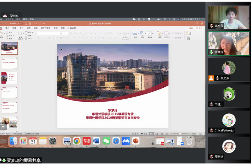 会上,赵宏结合自己华理英语系毕业生的身份进行了简短的致辞,分享了自己的从教经历;高攀回顾了自己在华理英语系从学生到教师的历程,向参会同学们强调了当教师要具备的特质和意识:责任、终身学习、回报;范彬围绕多彩而有意义的支教、任教经历,向同学们展示了自己从事教师一职的赤诚初心,并对于一路走来给过他职业启蒙的老师们表示了深深的感谢,认为优秀的人民教师应当坚守教育初心,做到育人先育己;罗梦玲回顾了本科阶段的学习生活、考研经历以及研究生阶段为就业所作的努力,提出想要成为一名合格的教师,需要积极参加各类活动和竞赛,在平时提升自己的专业素养、管理能力和人际交往能力;谢飞与同学们分享了她两段出彩的教学实习经历,以及如何在本研期间通过参加辩论社、创立辩论协会来提升各方面素养,从如何找准方向、如何制作出彩的简历、如何在应聘环节脱颖而出三个方面为学弟学妹提供了建议;吴汀玉结合自身的出国留学经历,与同学们分享了留学的经验体会、专业的选择、回国的准备和考编的过程,强调了提早进行教师职业规划的重要性。