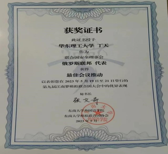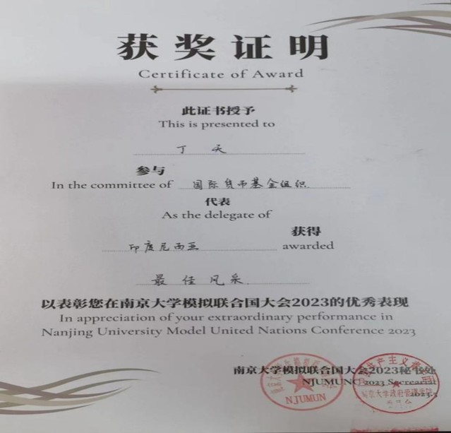 4月30日,丁天同学代表开元官网应邀参加南京大学模拟联合国大会,与来自南京大学、上海外国语大学、南京外国语学校等四十所高校及高中的近百名主席、代表、观察员共同参与,并通过出色的表现获得“最佳外交风采奖”。