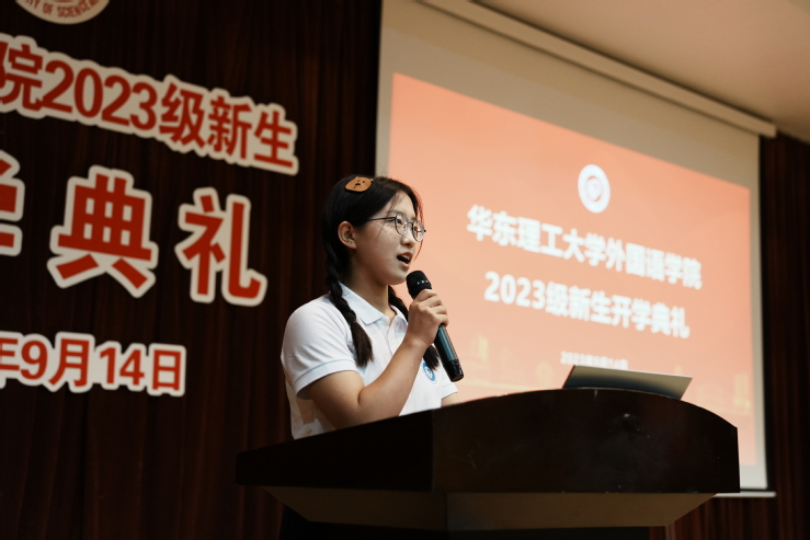 2023级日语语言文学专业邸佳媛代表研究生新生发言。她带领新生们共同思考“为什么来到这里”“我们的使命是什么”“如何度过研究生时光”三个问题。随后她提出目标,与同学们共勉,希望大家坚守初心,勇往直前,追求真理,勇攀高峰,为社会的发展和祖国的繁荣贡献自己的力量。