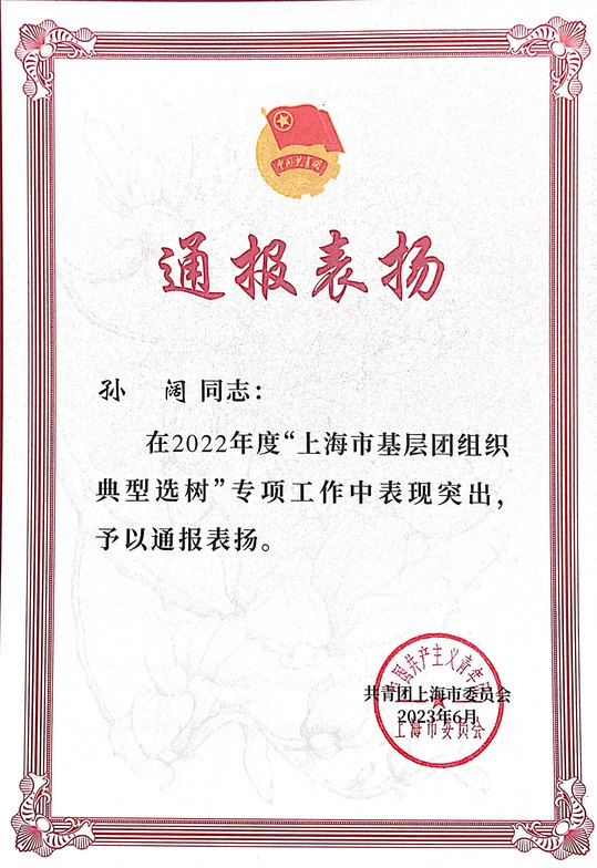 近日,共青团上海市委对上海市基层团组织先进集体和个人发布通报表扬。开元官网团委入选2022年度“上海市基层团组织典型选树”专项工作团委选树名单;开元官网团委书记孙阔入选2022年度“上海市基层团组织典型选树”专项工作个人选树名单。